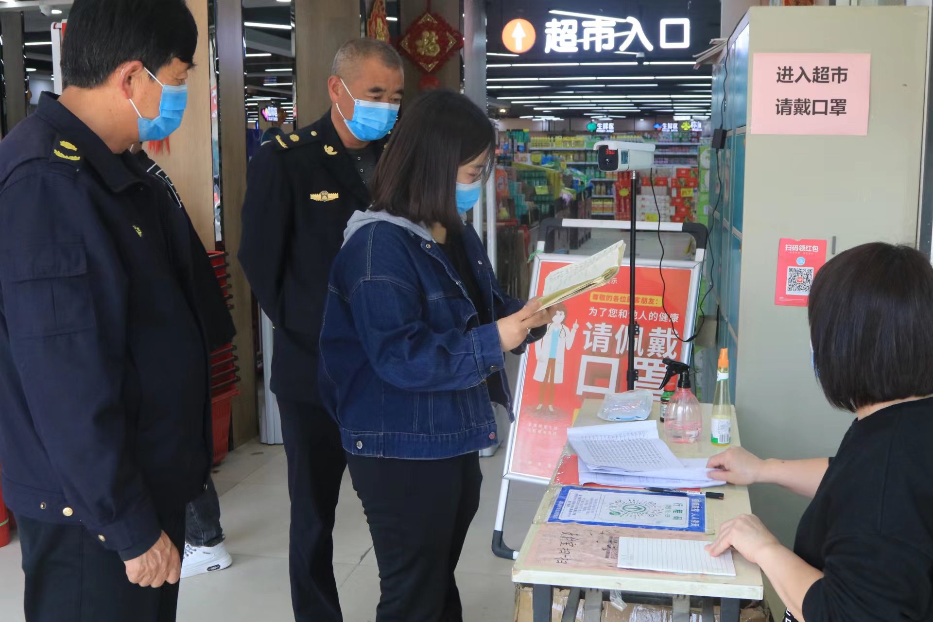 涡阳县公吉寺镇纪委干部在超市督查疫情防控措施落实情况。