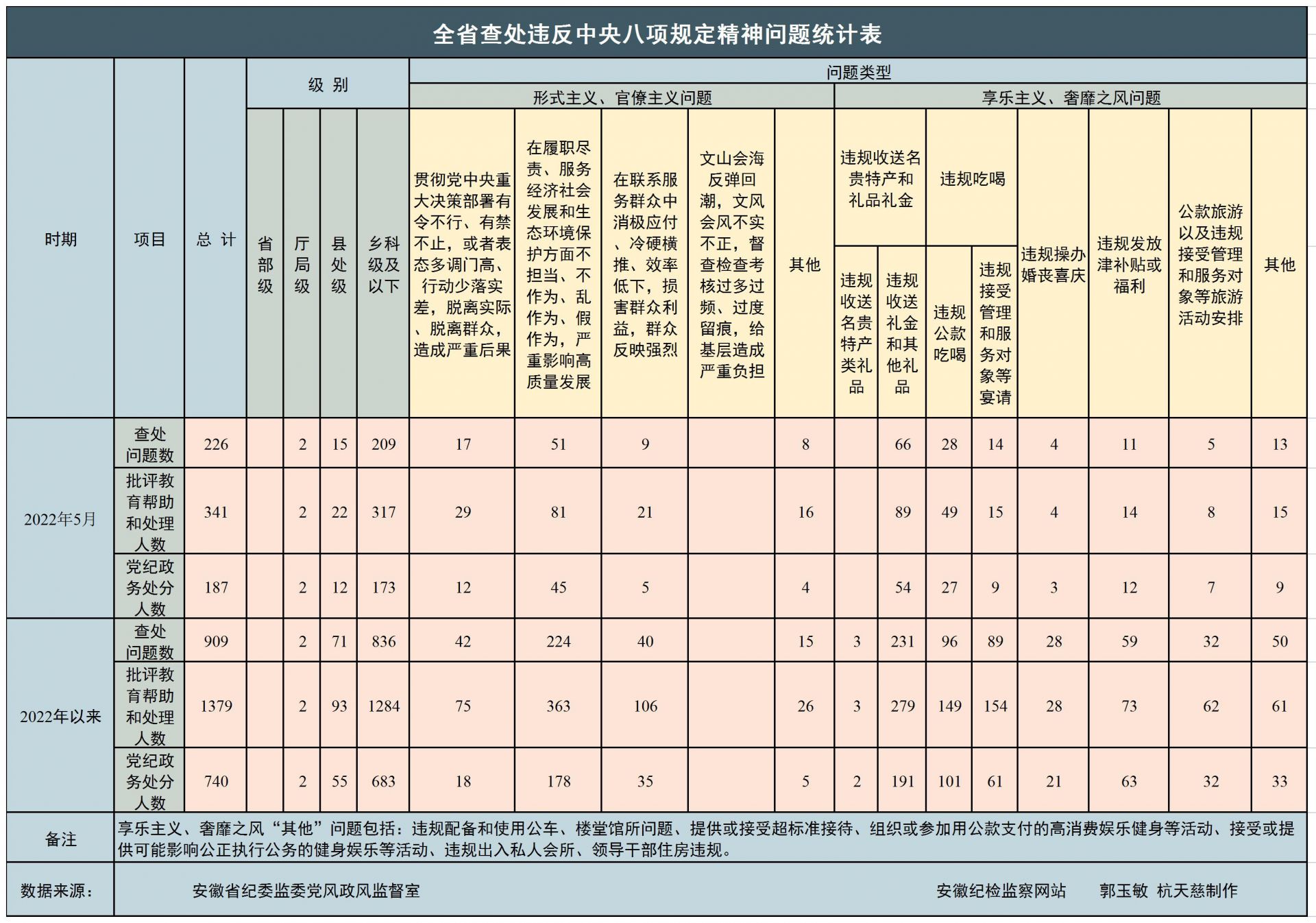 ● 2022年5月,安徽省纪检监察机关共查处违反中央八项规定精神问题226起,批评教育帮助和处理241人,其中给予党纪政务处分187人,同比分别下降21.0%、17.0%、13.8%。