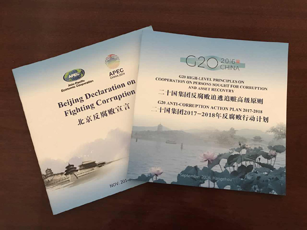 APEC《北京反腐败宣言》、《二十国集团反腐败追逃追赃高级原则》和《二十国集团2017至2018年行动计划》。