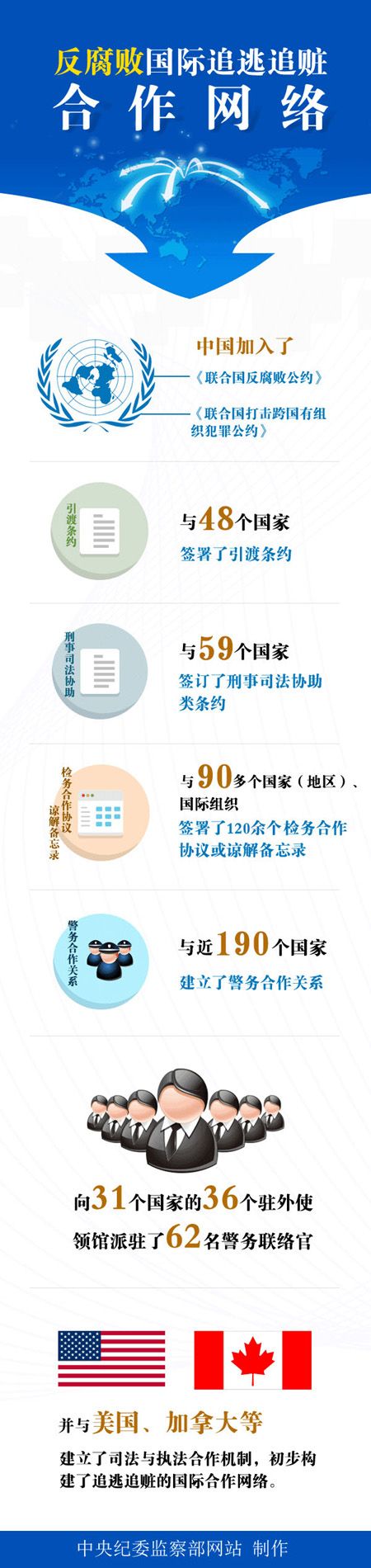 截至2016年12月,中国同90多个国家和地区的反腐败机构建立了友好关系,有力推动了引渡条约、刑事司法协助条约等谈判、缔约、履约进程,与外国反腐败机构签署合作协议27份。这一系列成果是推动全球反腐败治理体系变革的重要举措,也是倡导构建国际反腐败新秩序的生动实践。