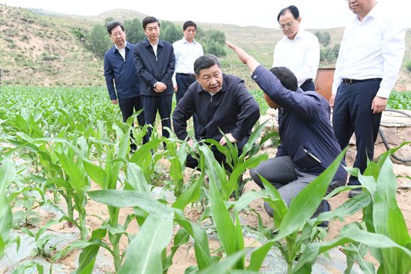 这是6月21日下午,习近平在忻州市岢岚县赵家洼村玉米地察看抗旱保墒措施。(新华社记者 李学仁 摄)