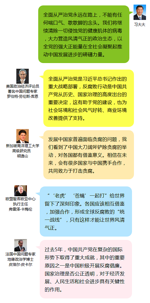 新加坡学者表示,“相信在未来,会有很多国家与中国携手合作,共同致力于打击贪腐”。欧盟专家认为,“各国应该相互借鉴,加强合作,形成全球反腐败的“统一战线”,只有这样才能让世界风清气正”。