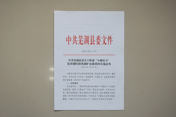 为将全面从严治党向基层、纵深推进,深入推进芜湖县“小微权力”监督制约新机制扩面提质工作,根据县委巡察工作部署,在全县5个镇抽查10个村(社区)开展“小微权力”规范运行情况专项巡察,重点对村级“三资”管理、工程项目实施、物品采购等“微权力”运行情况进行专项“体检”,促进基层党员干部规范履职、廉洁用权。