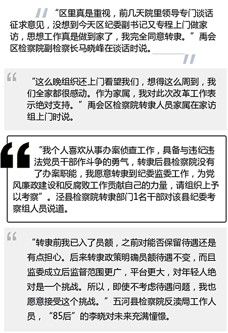 黄山市纪委制定《全市检察系统转隶人员谈心谈话、考察测评、上门家访方案》,联合市检察院相关领导组成三个组开展上门家访,通过进家入户、面对面交流的形式,积极主动倾听转隶干部家属的思想动态和关注热点,了解干部职工工作生活中的主要困难和心理顾虑,摸情况、强沟通、解难题、增感情,确保监察体制改革人员转隶工作又快又稳地推进。