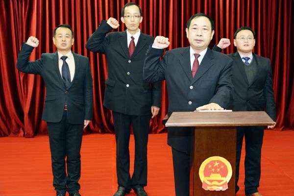 新当选的县监察委员会主任杨登峰在全体人大代表的见证下,现场向宪法宣誓