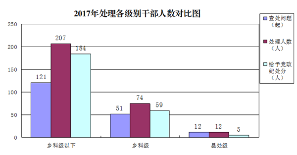 从问题查处的对象看:2017年,共查处县处级党员干部违纪问题12起,处理12人,给予党纪政纪处分5人;查处乡科级党员干部违纪问题51起,处理人数74人,给予党纪政纪处分59人;查处乡科级以下党员干部违纪问题121起,处理人数207人,给予党纪政纪处分184人。县处级、乡科级及乡科级以下党员干部党政纪处理人数,分别是2016年同期的55.6%、86.8%、136.3%。(具体见图表三)