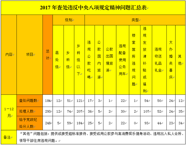 2017年,蚌埠市共查处违反中央八项规定精神问题184起,处理违规违纪人员293人,给予党纪政纪处分248人,查处问题数同比下降18.9%,处理违规违纪人员数和给予党纪政纪处分人员数同比分别上升3.5%、17%,一降两升凸显正风肃纪新成效体现出执纪必严、违纪必究和越往后执纪越严的坚定态度。市纪委通报违反八项规定精神典型问题9批52起97人。(具体见图表一)