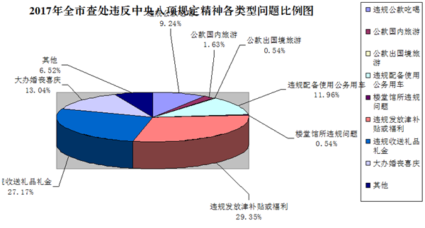 从问题查处的类型看:违规发放津补贴或福利54起,违规收送礼品礼金50起,大办婚丧喜庆24起,违规配备使用公务用车22起,违规公款吃喝17起,其他类12起,公款国内旅游3起,公款出国境旅游和楼堂馆所违规问题各1起。其中居前三位的违纪类型各占查处问题总数的29.3%、27.2%、13%,分别是2016年同期的114.9%、43.5%、114.3%。违规配备使用公务用车问题是去年的2.75倍,多是尚未进行车改的事业单位及以前发生的存量问题。(具体见图表二)