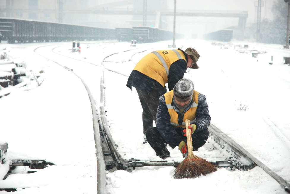 铁路工作人员冒着严寒,清理道口的积雪,保障畅通