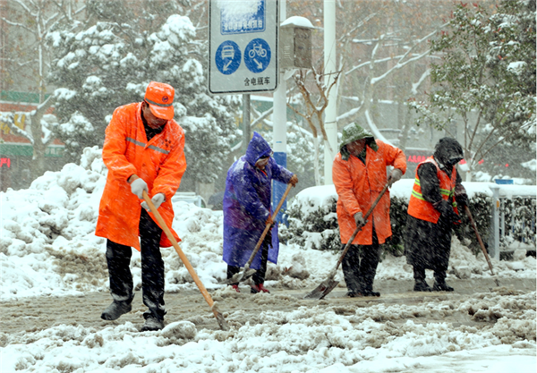天气严寒、环境恶劣,但这却阻挡不了市民们义务除冰铲雪的热情,大家纷纷加入到志愿者队伍当中。图为一名保安在清扫道路积雪。