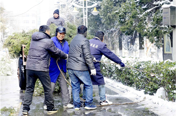 风雪过后,天气放晴,生产生活迅速恢复。图为工作人员清理树枝等路障,恢复市容环境。