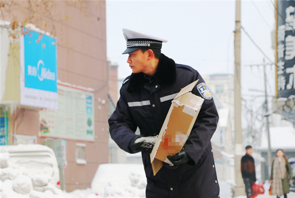 为了保障市民安全出行,一名交警在严寒中忙碌,对路面上的积雪冰冻进行应急处理。