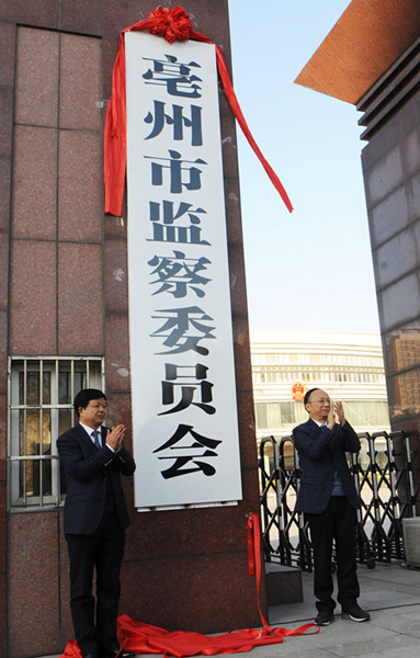 1月9日下午,亳州市监察委员会正式挂牌成立,标志着亳州市已圆满完成了市、县(区)两级监察委员会组建工作。亳州市委书记汪一光,亳州市委常委、市纪委书记、市监察委主任吕剑共同为亳州市监察委员会揭牌。市人大主任王玉玺主持揭牌活动。