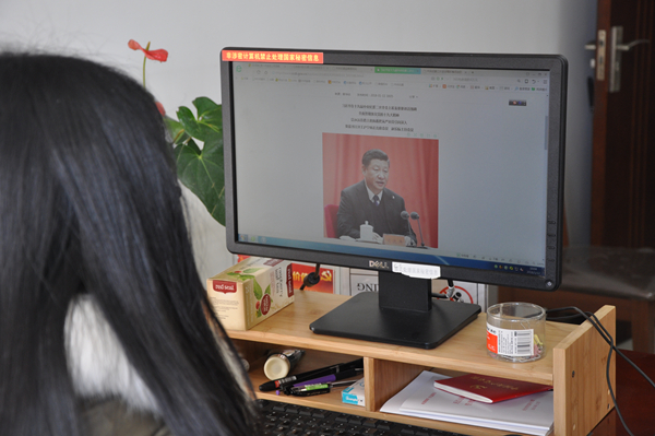 乡镇干部通过网络学习中央纪委二次全会,特别是习近平同志在全会上的重要讲话精神。