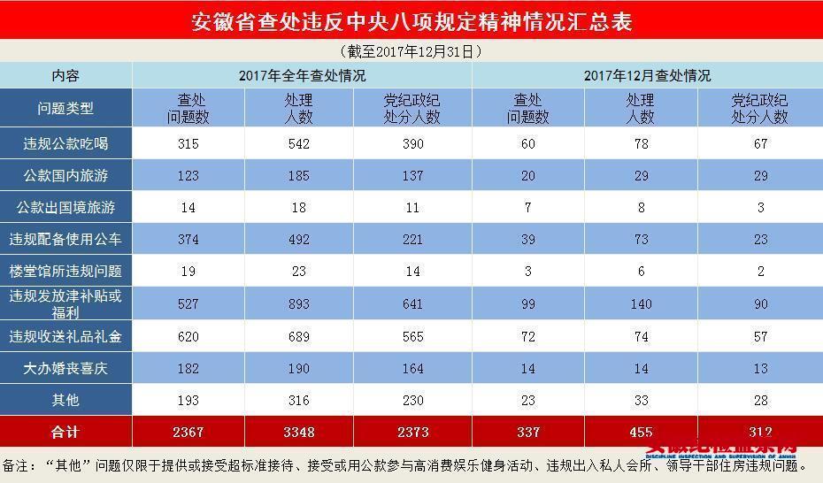 2017年以来,安徽持之以恒、锲而不舍推动中央八项规定精神落地生根,全年共查处违反中央八项规定精神问题2367起,处理3348人;给予处分2373人,包括厅级干部16人,处级干部154人。其中,去年12月,全省共查处此类问题337起,处理455人,给予处分312人。