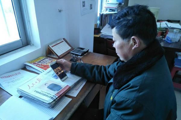 多年党龄的邮递员在手机上观看十九届中央纪委二次全会新闻