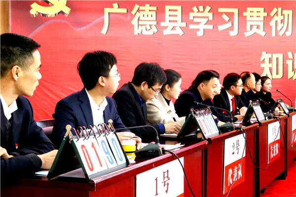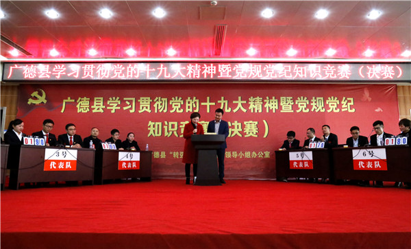 2018年1月12日下午,广德县举行学习贯彻党的十九大精神暨党规党纪知识竞赛决赛。在前期两轮比赛筛选过后,共有县委办、人大办、组织部等八支代表队进入决赛。经过个人必答、团队必答、抢答等三个环节,最终由县委组织部代表队摘夺桂冠,成为本次知识竞赛冠军。