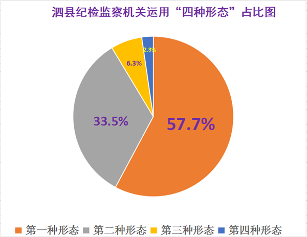 “运用‘四种形态’处理党员干部791人次。其中,运用第一种形态457人次,占57.7%;第二种形态265人次,占33.5%;第三种形态51人次,占6.3%;第四种形态18人次,占2.3%……。”2017年以来,泗县纪检监察机关强化责任担当,厘清角色定位,围绕“四种形态”把监督执纪问责做深做细做实,突出执纪重点,坚持抓早抓小、挺纪在前,推动全面从严治党向纵深发展。