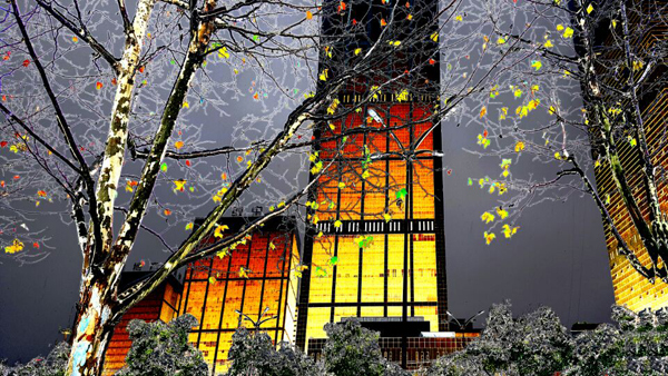 虽然天气寒冷,但是都市的夜色仍旧璀璨煌明,高楼大厦霓虹闪烁,路边绿植彩灯朵朵,和枝叶间的积雪凝冰遥相呼应,勾勒出一幅盛世的繁华景象。