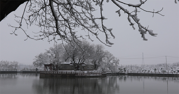 一场寒潮过后,刘铭传故居掩映在冰雪之中,坐落在湖中的读书岛银装素裹、古雅静谧,沉心细听,似乎有朗朗书声从过往的时空中传来。