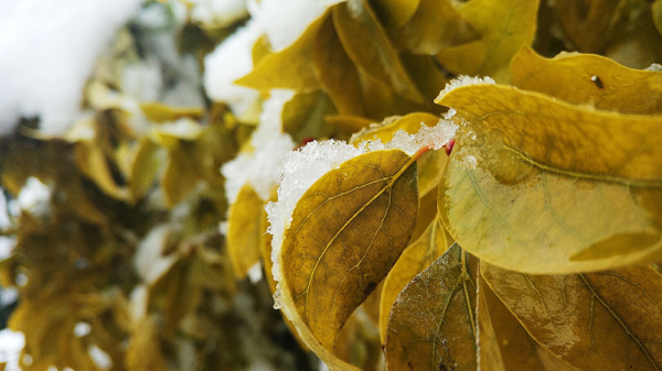 轻白的雪,黄嫩的叶,细碎的冰屑,虬曲的叶脉,清冷的空气,润湿的植被,生机和沉寂交织,萧瑟与繁茂共存。