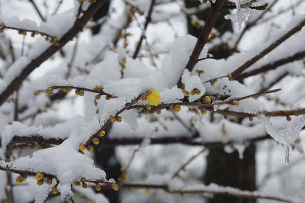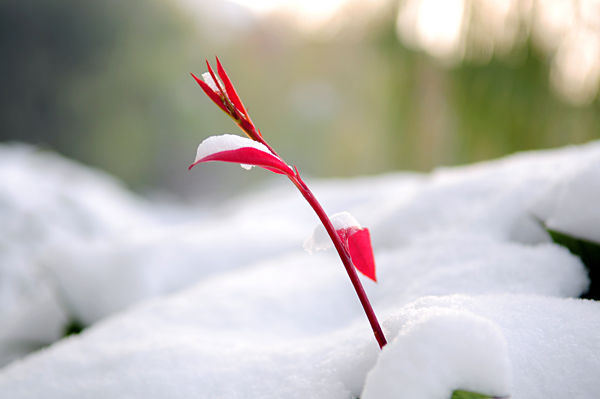 沉沉白雪覆盖在大地上,为万物披盖上安睡的厚絮,在这冷清萧肃中,有一抹稚嫩的轻红调皮的探出头,摇曳出勃勃生机,似乎在呼唤春天的到来。