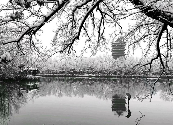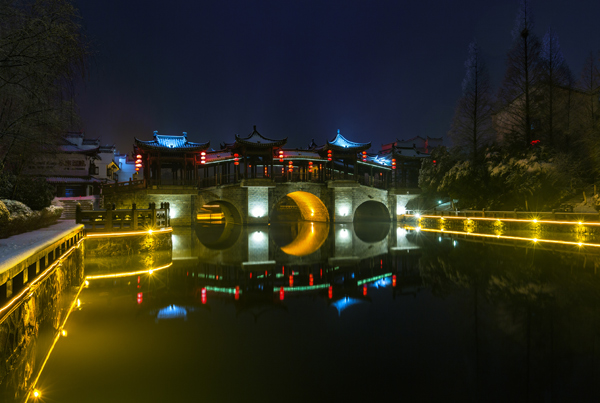 夜色深沉,雪意轻薄,长河漠漠,水静无波,远近高低的灯火映照在水中,为这寒夜增添了数分暖意。有千年历史的古桥长亭静默的矗立,似乎在回味着过往、细数着流年。