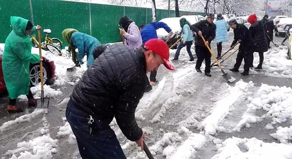 高新区组织纪检监察干部来到社区街道,铲除小区车库出口位置积雪。