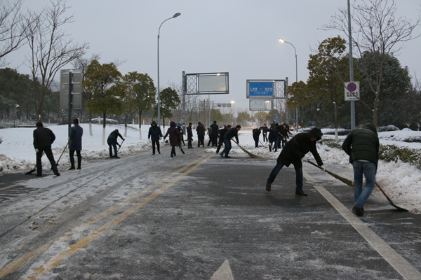 扫雪过程中,大家有的拿铁锨铲雪,有的拿扫帚随后清扫,分工明确,配合默契,天气虽然寒冷,但大家干劲十足。由于积雪成冰,清扫困难,大家充分发扬不怕苦不怕累的精神,不畏天寒路滑,扫不动就铲,铲不动就推,齐心协力,互相配合,经过1个多小时的奋战,夜幕降临时终于将责任区清扫的干干净净。