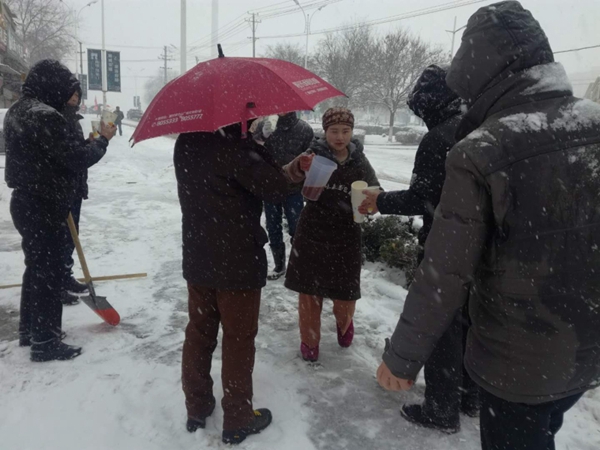 沿线居民为大家送来热饮,让党员干部们暖身更暖心。