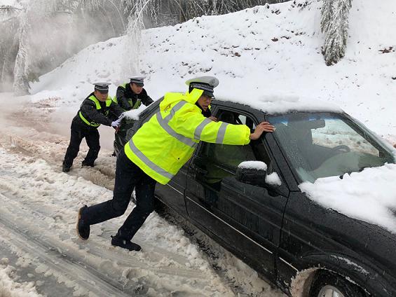 交通部门党员在湿滑道路上奋力推动汽车一路前行