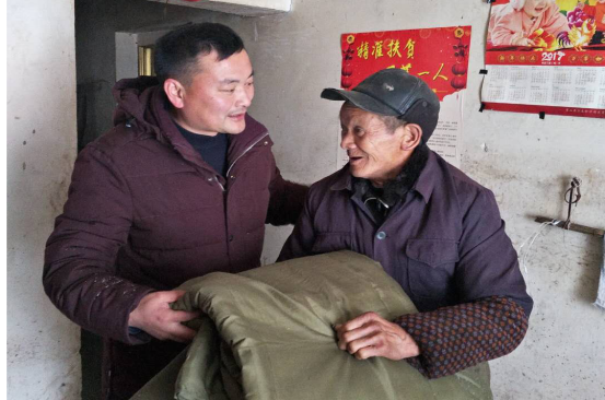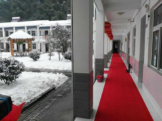 乡镇党员干部在敬老院的走廊铺满了长长的红地毯