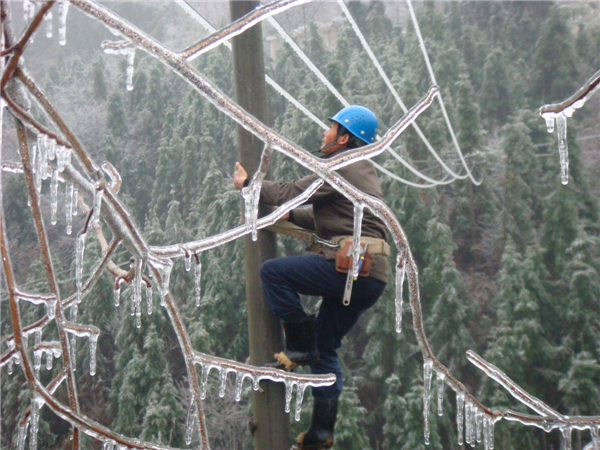 供电部门党员在寒冰中爬上高塔检查线路确保用电安全