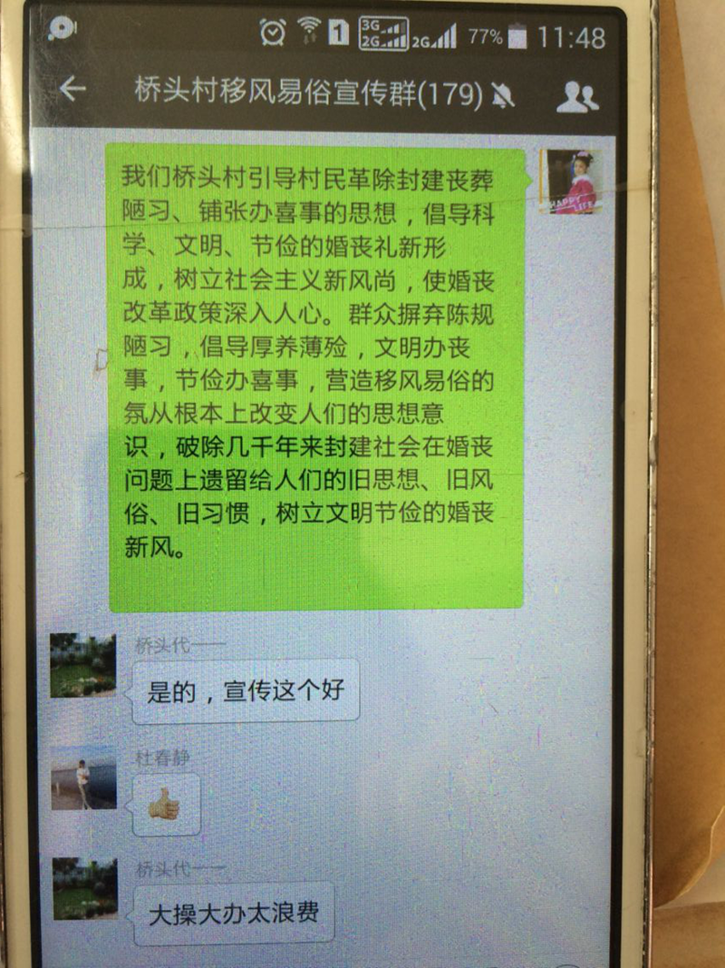 注重教育,提升文明意识。通过区纪委微信公众号、区纪委网站、廉政短信平台,向全区党员干部推送移风易俗倡议书,发送倡议短信,广泛宣传移风易俗活动。印发《对全区广大党员干部的一封信》,建立谈话提醒、个人承诺、分级报备制度,引导党员干部坚持廉洁自律、勤俭节约、以身作则,做移风易俗的倡导者、传播者、实践者。建立“农家党员e站”,发挥党员干部在政策宣传讲解等方面的积极作用。发动农村文化骨干队伍、乡贤骨干队伍,并利用宣传展板、文化墙和广播等媒介,深入宣传大操大办、铺张浪费的危害。将移风易俗作为农村道德讲堂必讲内容,经常讲、深入讲,力求达到入脑入心的效果。组织发放移风易俗倡议书8000余份,在各村绘制移风易俗文化墙,编排移风易俗戏曲节目进行巡演。在清明节推广“鲜花换纸炮”活动,倡导文明祭扫。