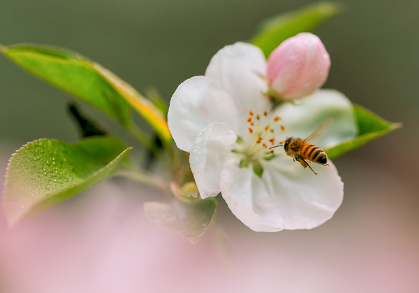 碧绿的叶,洁白的花,粉红的蕾,金色的蕊,春天在这个角落里,向远道而来的小蜜蜂绽开一个甜美的微笑。