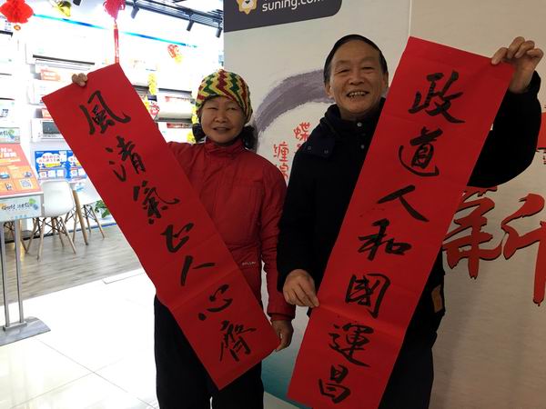 当天,苏宁集团邀请了该市书法学会会长汪东等3名书法大家现场挥毫泼墨,不一会儿一副副满载着祝福的廉政春联就跃然纸上,社区居民纷纷对这种内容新颖的春联点赞。活动结束后,社区工作人员携带书写好的新春对联与福字送到社区居民家中,送去节日的祝福。