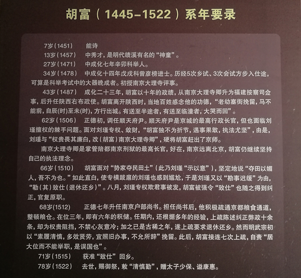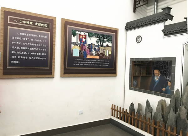 该馆占地面积约800平方米,展厅陈列面积约200多平方米,分为“少年神童、大器晚成;公正执法、平反冤狱;刚正不阿、不畏权贵;勤政廉政、爱民如子”四个展区,通过图片、视频、雕塑、实物、场景等多种形式,借助声、光、电、影等现代科技手段,生动直观地展现了胡富勤政廉政的感人事迹,喻志言情、律已教人。胡富纪念馆,紧邻“爱国主义教育基地——胡宗宪少保府”,与“全国重点文物保护单位——胡氏宗祠、奕世尚书坊”相距约二三十米,爱国主义教育和廉政教育作用日益充分发挥。
