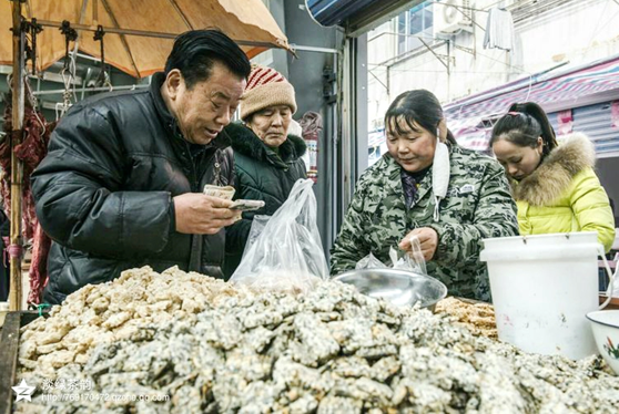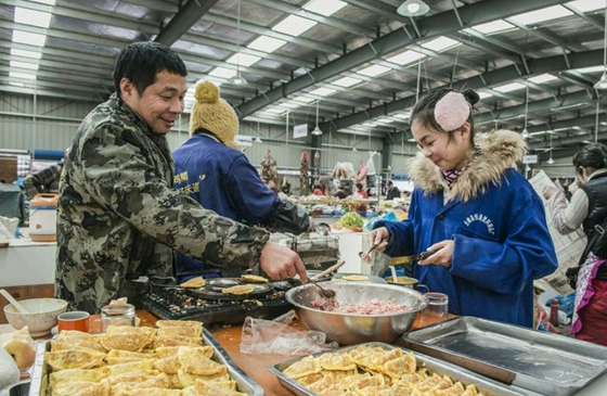 蛋饺作为舌尖上的美食在春节期间时常供不应求,摊位主父女俩趁着空闲加工饺子。