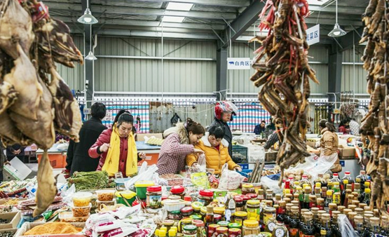 农贸市场腊味等商品琳琅满目,采购年货的群众川流不息,生意异常红火。