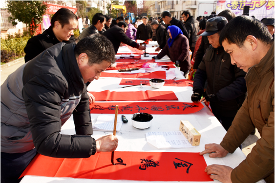 书法爱好者现场挥毫泼墨,义务为过往群众写春联、送祝福。