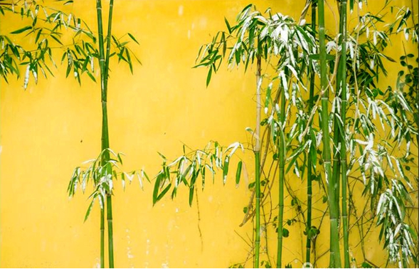 明黄色围墙边翠竹傲雪挺立,更显清新俊俏。