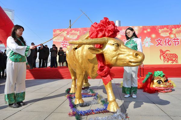 一年之计在于春,古老的民俗“打春牛”则是民俗记忆中的惹人瞩目的一道靓丽风景。在来安县建阳文化公园广场上,四里八乡的群众围聚在一起,伴随着主持人的念辞,手执柳条彩鞭,一个接一个鞭打“春牛”,祈福来年丰收、兴旺。