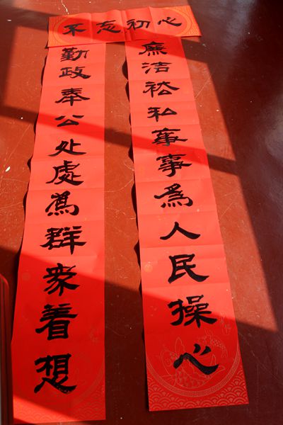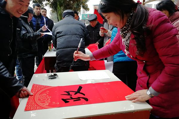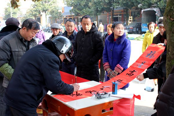 所谓“高手在民间”,骑着电动车上街的村民看到写春联这热闹的场面,随即亮出一手好字,引得路人驻足观看。