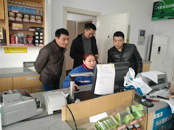 督查组在加油站检查公务加油卡使用情况。