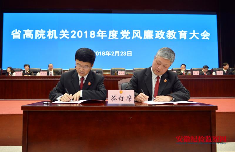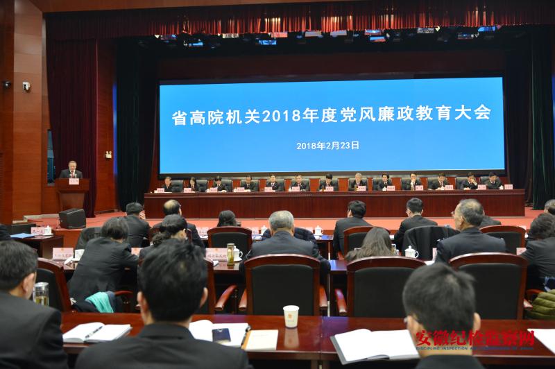 2018年2月23日上午,省高院在春节后上班第二天即召开院机关党风廉政教育大会,机关全体干警及从事审判辅助工作的其他人员近500人参加会议。会议贯彻了省纪委十届三次会议和全国法院党风廉政建设和反腐败工作会议精神,通报了2017年全省法院处理的六起典型违纪违法案例;院党组书记、院长董开军与其他院领导,分管院领导和分管部门主要负责人签订党风廉政建设责任书。省纪委监委驻省高院纪检监察组组长、院党组成员董震作了题为《正风肃纪不松劲 惩治腐败不停步 以永远在路上的执着推进全面从严治党》的讲话,总结回顾了过去五年省高院机关的纪检监察工作,指出了党风廉政建设中存在的问题,部署2018年省高院纪检监察工作。