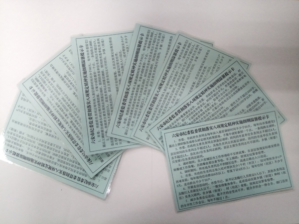 提示卡以卡片形式,将市委“实施细则”中“改进调查研究”、“严控会议活动”、“精简文件简报”、“改进新闻报道”、“坚持勤俭节约”等5个方面规定具体、容易疏忽的内容梳理成14条提示事项,便于随身携带、随时翻看,提醒各级领导干部时刻绷紧作风建设这根弦,增强执行八项规定精神的思想自觉和行动自觉,不断形成抓作风建设以上率下的“头雁效应”。(六安市纪委监委)