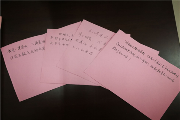 3月7日晚上7点,颍州区纪委监委会议室里仍是一片忙碌的景象。利用会议的休息间隙,男同志们亲手书写祝福卡片,送给在座的女同志们,用这种简单却温暖的方式为纪检干部队伍里的“巾帼”们庆祝三八妇女节。