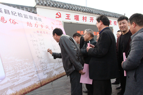 纪检监察干部们先后前往烈山区古饶镇赵氏宗祠、濉溪镇蒙村和刘桥镇王堰村等移风易俗示范点进行学习观摩。具有纪念家族历史、传承家风家训作用的赵氏宗祠,反映丰富多彩的民俗文化的蒙村民俗广场,创新建立“一约一书四会”工作机制的王堰村等,已经成为移风易俗的引领地,一张张展板、一面面墙体、一本本资料都透出浓厚的宣传氛围。在王堰村村部广场前,县纪委监委负责同志宣读了《移风易俗树新风倡议书》《移风易俗树新风承诺书》,参加活动的纪检监察干部纷纷在“承诺签名墙”进行集中签名。