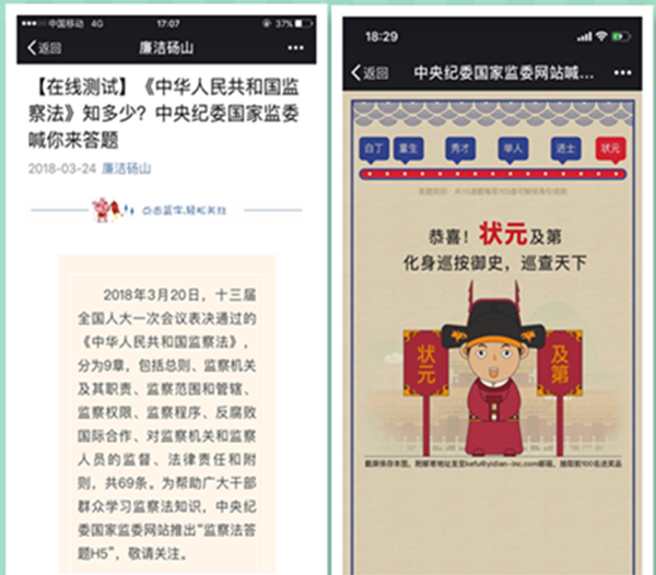 “我刚才测试的《监察法》知多少,错了一题,才得了个‘进士’。”