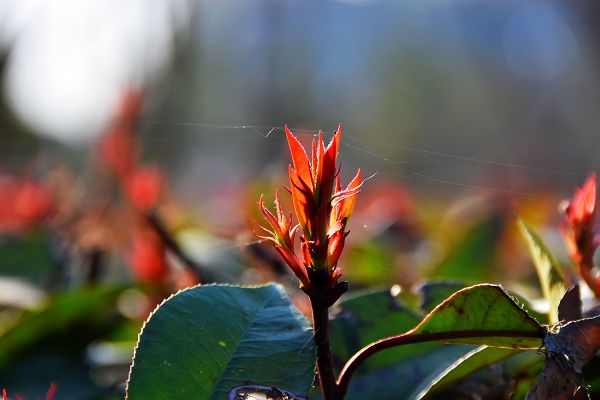 花重嫩舒红笑脸,叶稀轻拂翠颦眉。